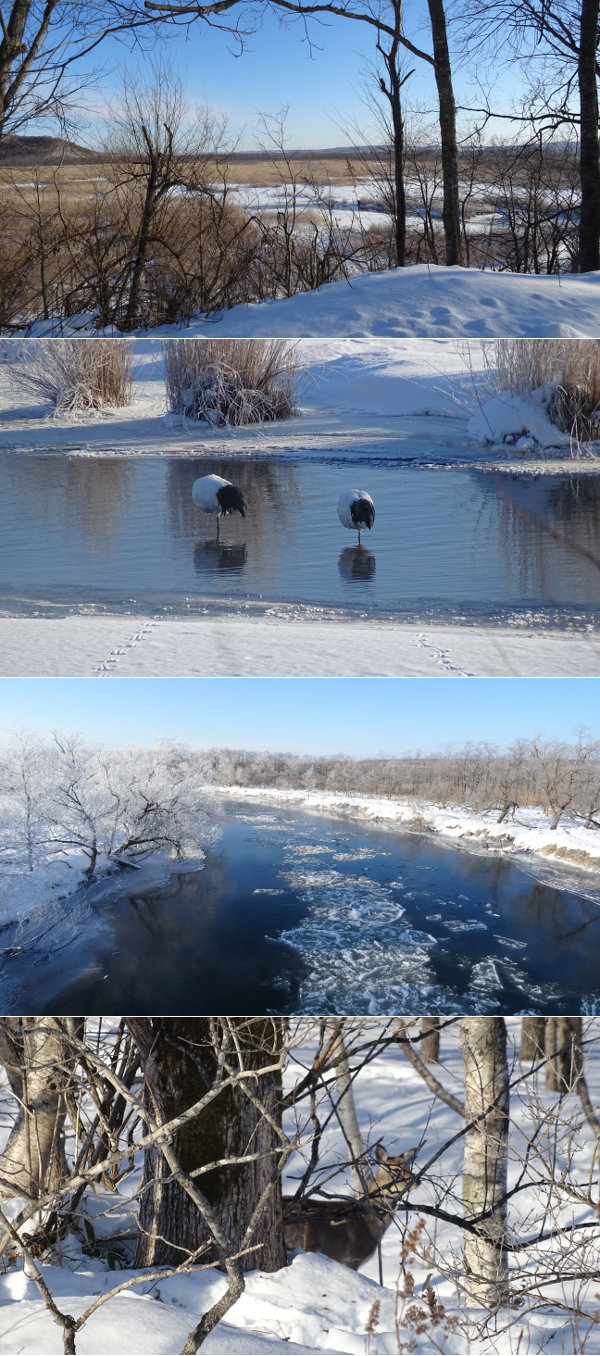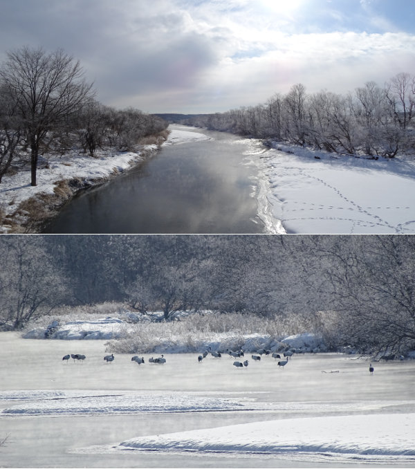 ここは音羽橋。野生の丹頂鶴のねぐらを観察出来る数少ないスポットで、外敵を避ける為に水の中に一本足で立って眠る様子が見られる・・・んだそうで。私が着いた時点で既に橋の上に20人くらいのカメラマンが、400mmとか500mmくらいありそうなでっかい望遠レンズを付けたカメラを構えていましたよ。しかし、鶴の姿が見えないな。