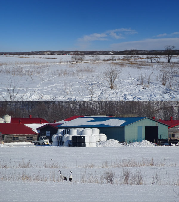 조금 동쪽으로 이동하고, 콧타로 다습 초원 전망대의 근처에서 학의 한 쌍을 발견.한 개켤레로 물속에 서 있구나.