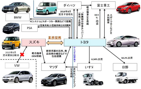 토요타와 스즈키는, 토요타 자회사의 다이하츠공업을 통해서 국내의 경자동차 선두를 싸우는 라이벌이다.한편 ,함께 방직기 사업이 조업으로, 루트는 시즈오카현 서부.스즈키 스즈키 오사무 회장이, 개인적으로 친교가 있는 토요타의 토요타 쇼이치로 명예회장에 제휴?`