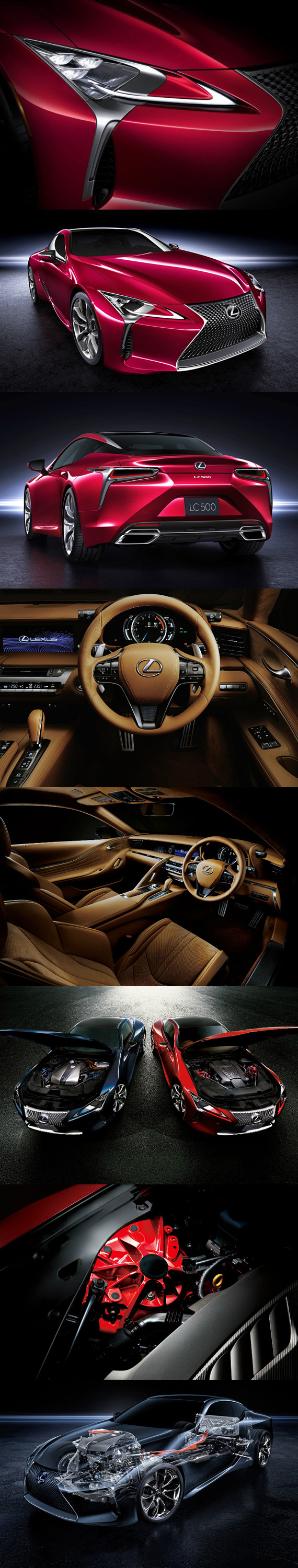 パワートレインは、ハイブリッドシステムに有段ギヤを組み合わせた世界初のマルチステージハイブリッドシステムをLC500hに採用。V型6気筒3.5リットルエンジンと走行用モーターの出力を制御することで、低速から力強い駆動力を生み出しパワフルな走りを実現するとともに、EV走行領域を拡大することで15.8km/リットル(JC08モード)の低燃費を両立した。またLC500は、最大出力477ps、最大トルク540Nmを発生する5.0リットルV型8気筒ガソリンエンジンと新開発10速ATとの組み合わせとなる。