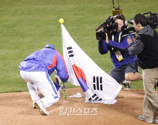 ∇화상은 2009년 3월 18일, 미국에서 행해진 제2회 WBC의 제2 라운드 1조 2 회전에서 일본에 승리한 후 마운드에 태극기를 찌르는 한국 대표.