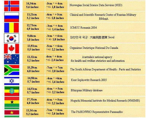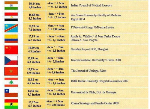 한국에 관해서는, 표준 범위를 밑도는 수치를 나타내는 연구가 있다고 한다.(주:스페인의 페니스 증대 기구 메이커가 간 조사에서도,한국에 있어서의 평균 사이즈는9.4센치라고 하는 데이터가 발표되고 있다.(상세한 것에 대하여는,http://www.prleap.com/pr/23498/)
