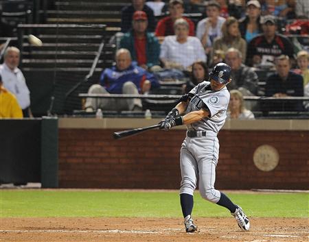 マリナーズのイチロー外野手(35)は12日(日本時間13日)、敵地アーリントンでのレンジャーズ戦に「1番・右翼」で先発出場し、ソ¥ロ本塁打を含む5打数2安打1四球1打点で米大リーグ史上初の9年連続200安打まであと「2」とした。打率は.355。