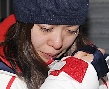 실격이 된 코무로 선수( 오른쪽).관계자에게 껴안을 수 있는 울면서 미안해요 라고 고개를 숙인=야마모토고유타카 촬영 스켈리턴 여자 코무로희(센다이대대학원)는 1회전의 스타트전에 실격이 되었다.