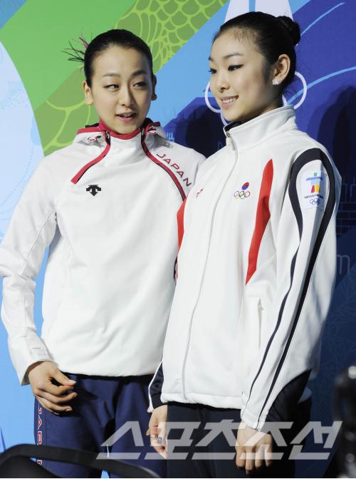아사다 마오의 상당한 비거리를 보여주는 신문의 사진...  관객이 다섯 쌍둥이가 왔어 똑같은 옷입고 똑같은 포즈로.. 왜 같이 않지 않았을까?