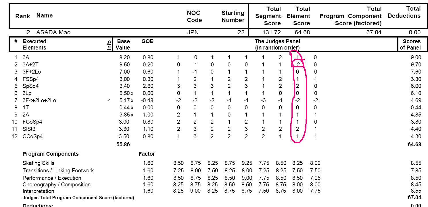 (マオの 3aと 3a -2tは回転数不足で -1‾-2 点が正当だ== 誰が -2点を与えたのか一番公正な審判だった..)