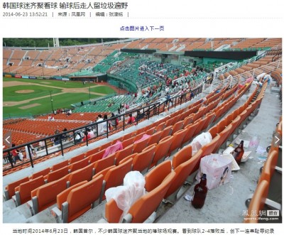 23日、ブラジルW杯韓国対アルジェリアの試合が行われ、多くのサポーターがソウルの野球場で観戦したが、2-4で韓国が敗れると、ごみをそのまま放置して球場を去った。