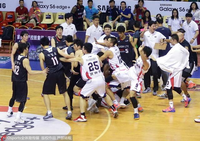 前半終了時点で38-54と劣勢だった佛山は後半、ディフェンスを強化。双方は接触が相次ぎ、ついに堪忍袋の緒が切れたのか、2人の選手が取っ組み合いを始めた。すぐ近くにいた数人の釜山の選手が加勢し、佛山の選手を取り囲んでどさくさに紛れてひざで太ももを蹴り付けたりした。