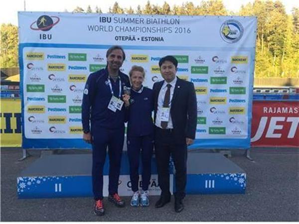 8월말에 개최된 바이어스론 하계 세계 선수권 여자 스프린트로 사상최초의 메달을 획득한 안나・프로리나(중앙).평창올림픽에서의 메달 획득에 기대는 급상승이다(연합 뉴스의 홈 페이지로부터)
