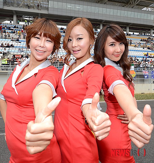 전라남도령암의 코리아·인터내셔널·서킷에서는 14일, 포뮬러·원(F1) 한국 그랑프리(GP) 결승을 했다.사진은, 포즈를 취하는 구라두 걸(레이스전의 플래카드등의 게시 요원)들.
