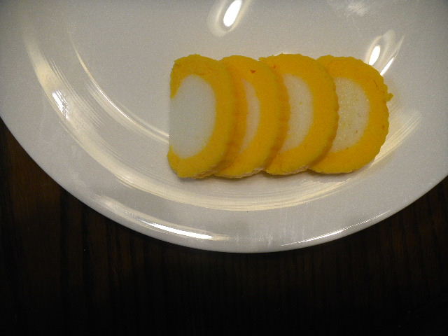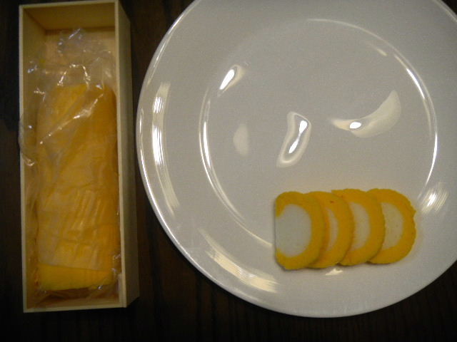 蒲鉾(kamaboko)(魚の練り物食品の一つ)。これは、神奈川(kanagawa)県(東京圏の南部を占める県)の、小田原(odawara)(多くの蒲鉾(kamaboko)店(蒲鉾(kamaboko)会社)があり、東京圏(関東)における、蒲鉾(kamaboko)の代表的な産地となっている)の、みのや吉兵衛(minoya kichibe。約450年の歴史を有する、蒲鉾(kamaboko)会社)の、蒲鉾(kamaboko)で、マートで買いました。蒲鉾(kamaboko)は、お節(osechi)料理の一つでもありますが、別に、日本で、普段、よく食べられている食べ物でもあります。