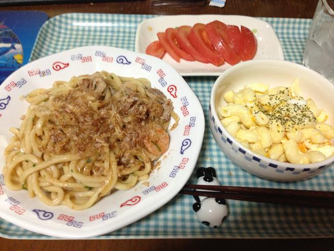 焼きうどん・トマトスライス・スーパーの惣菜のマカロニサラダ。