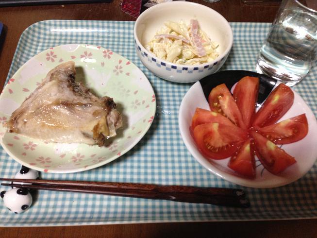 ブリカマの塩焼き・トマトw・スーパーの惣菜のサラダ。