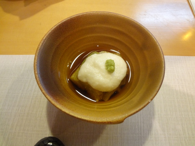 突き出しの焼きナスの山かけです。