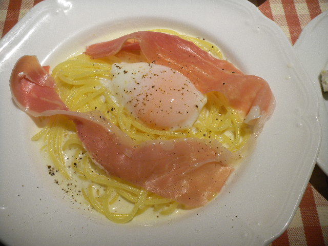 生ハム(ham)と、半熟玉子の、カルボナーラ(carbonara)スパゲッティ(spaghetti)。
