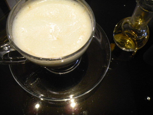 この時、私が、このカフェ(cafe)で飲んだ、飲み物。アイリシュコーヒー(Irish coffee)風のコーヒー(coffee)。右は、風味を付ける為に、コーヒー(coffee)に、お好みで(好きな量)入れて飲む、ウイスキー(whiskey)。