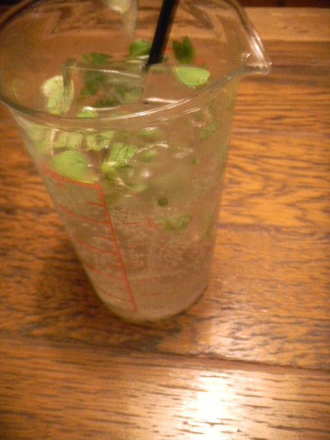 이 때, 그녀가, 이 카페(cafe)에서 마신, 음료.모히트(mojito) 풍의, 무알코올 칵테일(mocktail)(그녀는, 알코올(alcohol)은, 체질적으로, 꽤 서투릅니다).이 가게의, 차가운 음료의 대부분이, 글래스(glass) 대신에, 500 ml의, 비커(beaker) 풍의, 계량 컵(measuring cup)에 들어가 나오는 w.