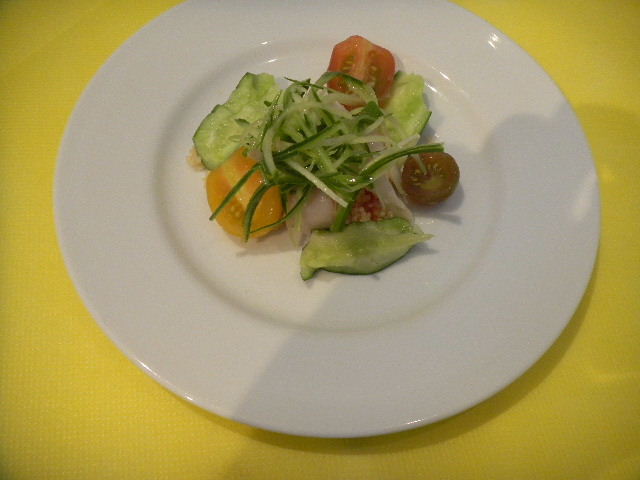 小さな前菜。イカ(烏賊)のマリネ(marinade)。一人一皿ずつ。