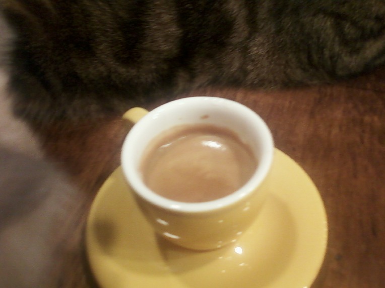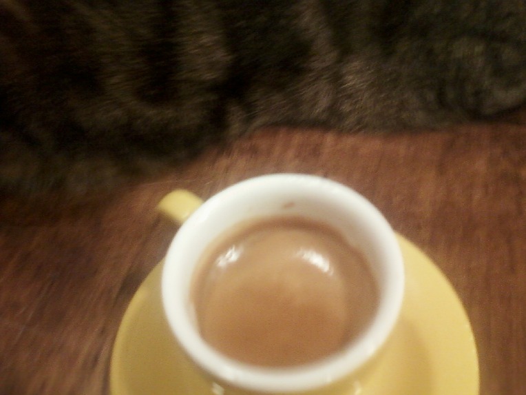 고양이의 식사와 간단한 에스프레소 커피 ..