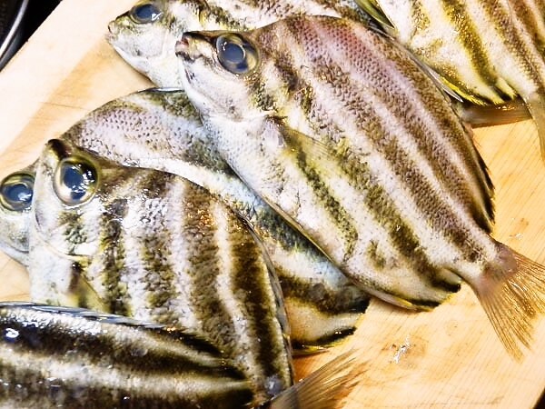 바구니 감 다이, 결코 자코는 아니지만, 도쿄에서는 별로 익숙한 것이 없는 것일 것이다.손바닥만한 작은 물고기로, 모양이 에도시대의 롱을 메는 사람의 옷(기모노)의 모양을 닮아 있기 때문에「롱감 도미 」.