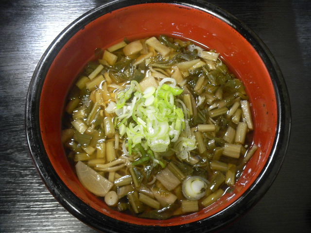 すんき(sunki)蕎麦。二人で分けて食べました。すんき(sunki)とスープ(soup)に隠れて見えませんが、下の方に、ちゃんと(しっかりと)蕎麦が、沈んでいます。すんき(sunki)は、木曽(kiso)area(長野(nagano)県の南西部area)の家庭で、古くから食べられている、保存食で(特に、冬の時期の家庭の食事には、欠かせない物であった様です)、木曽(kiso)赤蕪(木曽(kiso)areaの、古くからの、特産物(その地方、独特の、よく、獲れる(よく、生産されている)産物)の一つ)の、葉を、植物性の乳酸菌で、発酵させた漬物です。すんき(sunki)蕎麦は、この時、初めて食べたのですが、中々、美味しかったです。