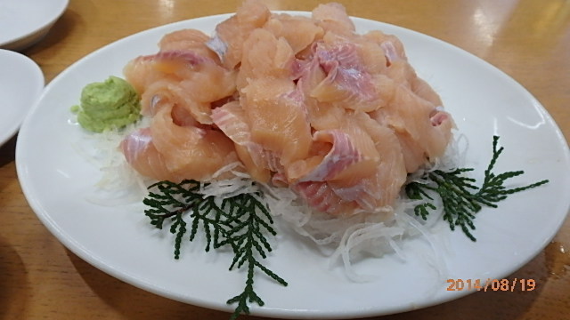 저녁에 관리 낚시터의 식당에 가지고 가서 생선회로 해 받아, 매스의 생선회를 먹는다.
