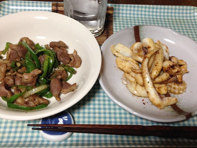 砂肝・ピーマン・玉葱のクミン炒めと、イカゲソのバター醤油炒め♪