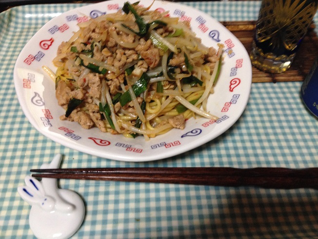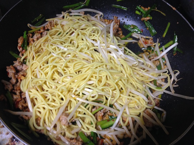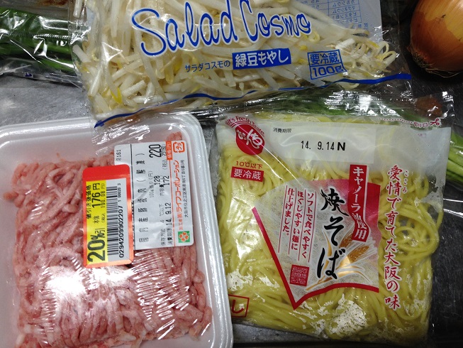 豚ミンチ・焼きそば麺・もやし・ニラその他。