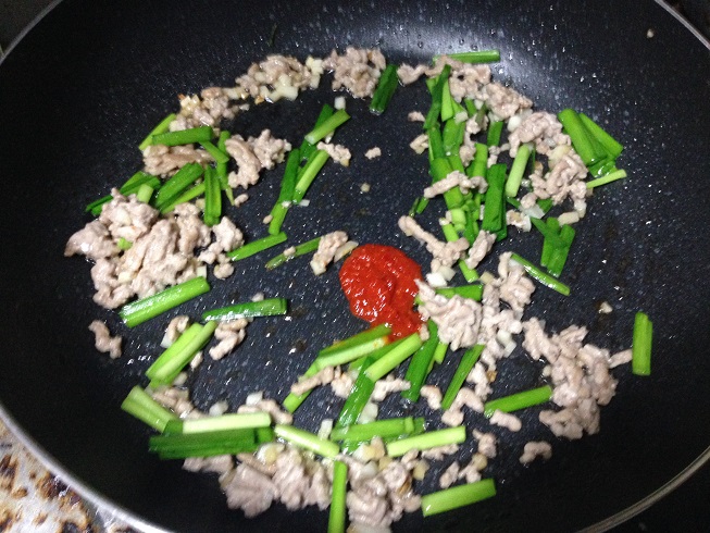 마늘과 생강의 잘게 썬 것을 볶아 돼지 다진 고기와 니라를 투입.