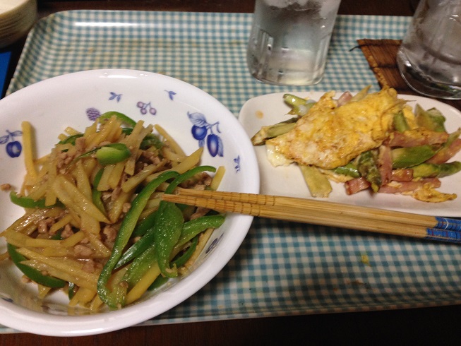右 ベーコンとアスパラの卵炒め