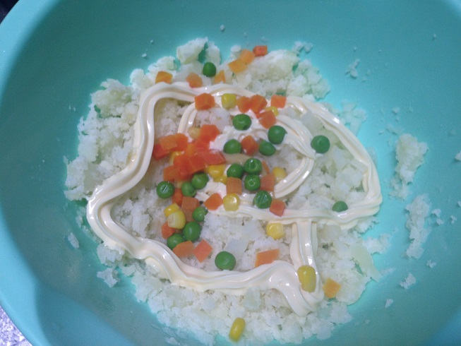 潰したら、刻み玉葱・ミックスベジ入れて、塩胡椒・マヨ・芥子入れて混ぜ混ぜ~♪