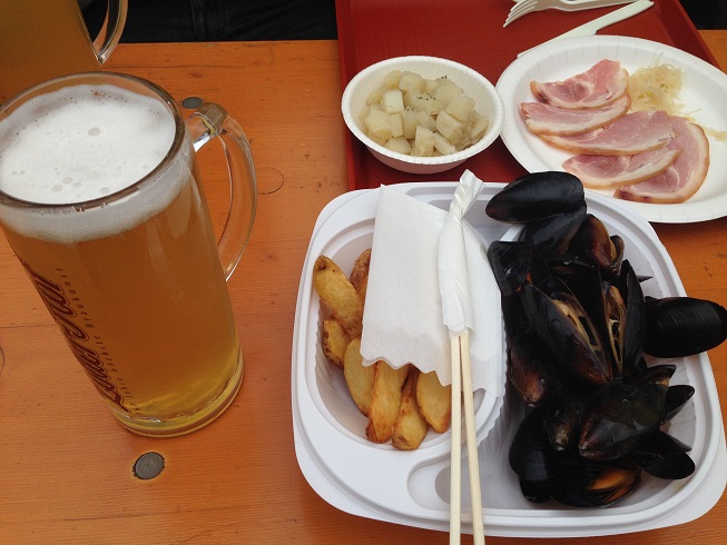 一発目のビール(以降、オール500mlなw)と、ムール貝(ガーリックバター味)とアイスバイン(っぽいのw)で、プロージット!!w(゚Д゚)ノ□