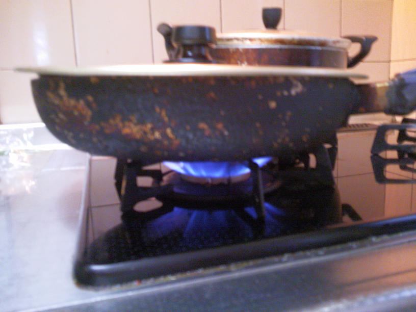 소금하고 프라이팬에 전면에 깔면