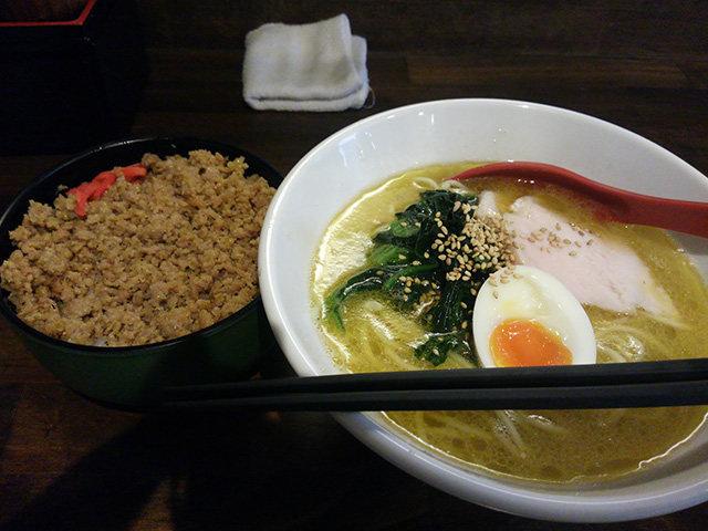 ラーメンに小さい鶏そぼろ丼を追加。