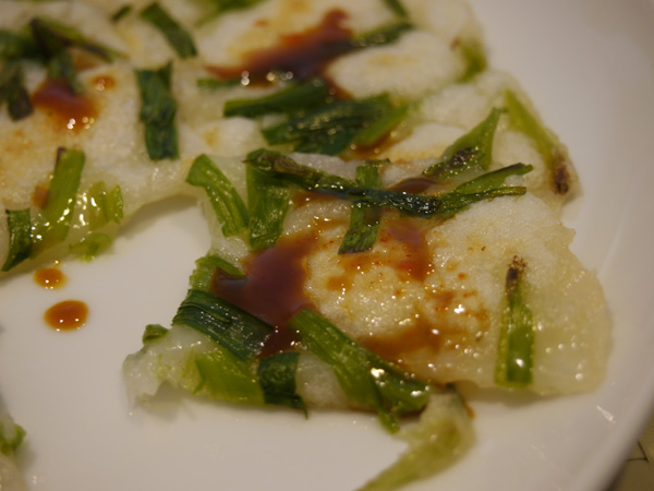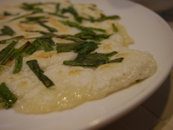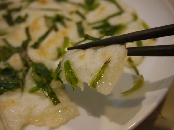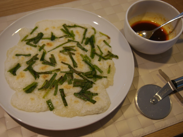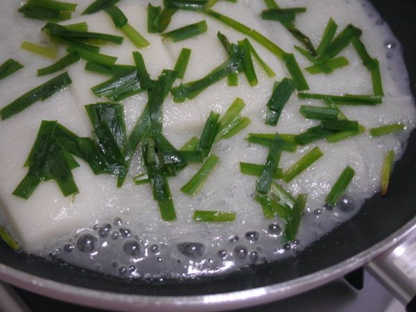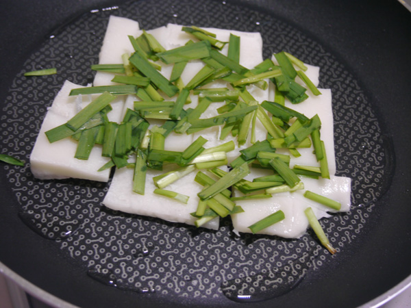 프라이팬에 늘어놓은 모치 위에, 니라를 잘라 실어 보았습니다.