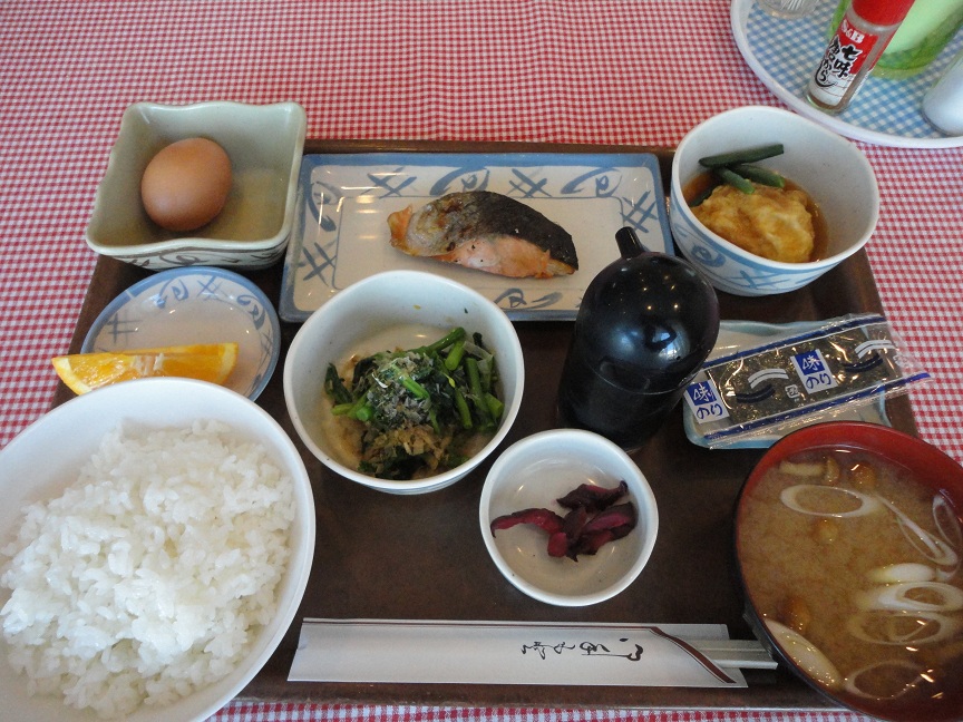 オレンジ。生卵。塩鮭。卵とインゲン豆。なめこの味噌汁。きゅうりのシバ漬け。菜の花のおひたし。