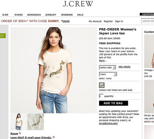 미 어패럴 브랜드의 J.CREW가 지진 재해 후, 일본을 지원하는 자선 T셔츠를 발매했는데, 한국으로부터 비난이 쇄도했다.