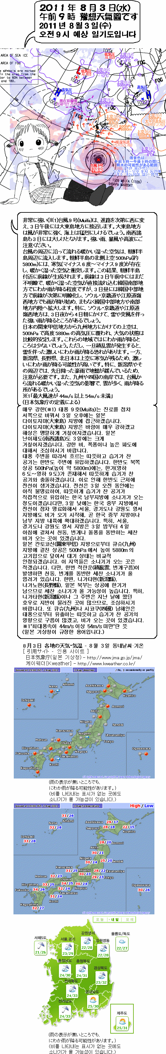 일본 칸토코신(關東甲信)으로부터 서쪽의 상공은 태평양 고기압의 조각으로 덮일 것 같아요. 이것을 계기로서 이번주 후반 이후에는 일본은 서부로부터 점차 한 여름 날씨가 부활할 것 같아요. 한편, 한국은 점차 전선이 명료화해서 특히 중부 지방은 내일 오후 이후부터 모레에 걸쳐서 강한 비가 올 염려가 있어요. 태풍은, 모레 일본 오키나와(沖繩) 근처를 통과할 것 같아요. 그 후 어떤 진로를 나아가는지는 아직 불확정 요소가 많아요.