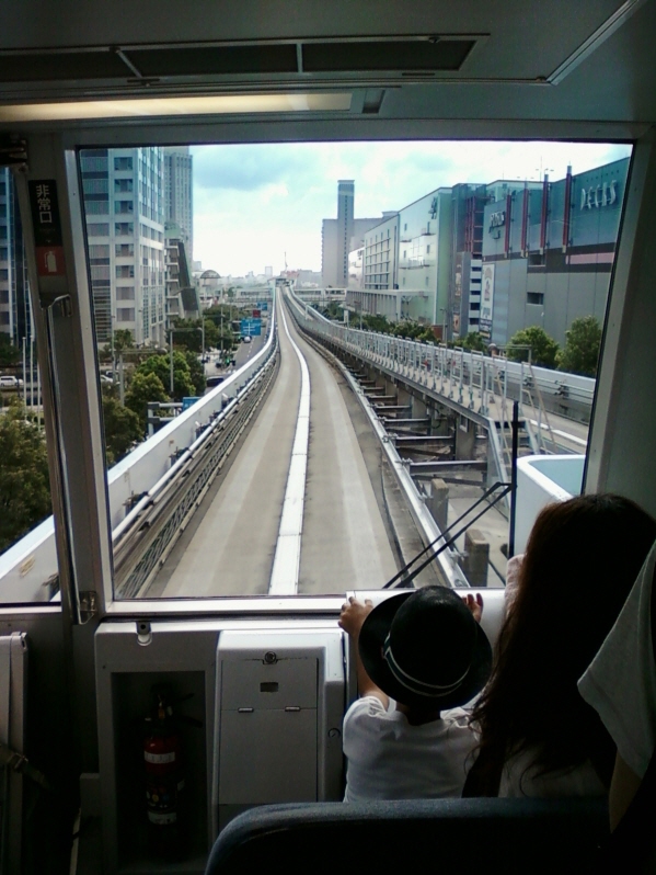 유리카모메호의 중앙 창문의 모습.. 이 열차의 특징은 전 자동이라 가장 앞에서도 전차가 가는 광경을 잘 볼 수가 있습니다. 도쿄의 사람이 아닌 아이와 엄마가 사진을 찍고 있는 것 같네요.  저도 뒤에서 한 컷!