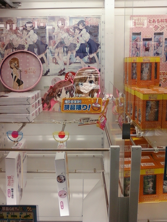 ゲームセンターにある ufoケチョの商品たち.. やっぱり秋葉原みたいな商品たちがかかっています. しかし ufo砲手はお金食べる機械なので自制.. ほしいものなどが多いです.