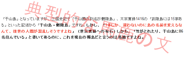 千年と言う(のは)長年の歳月を鬱陵島で住んでいた人々が聖人峯の 120メートル地点, また海で 20里さえ出ると見える独島が分からなかったと言うことは誤った主張だ(金並列, 「独島かダケシマか」(1997, 畳みディア), 160-162, 353-354ページ.