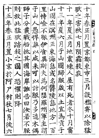 ○十三年, 夏六月, <于山国>帰服, 歳以土宜為貢. <于山国>在<溟州>正東海島, 或名<鬱陵島>. 地方一百里, 恃 不服. 伊 <異斯夫>為<何瑟羅州>軍主, 謂<于山>人愚悍, 難以威来, 可以計服, 乃多造木偶師{獅} 子, 分載戦船,  {抵} 其国海岸,  告曰: 汝若不服, 則放此猛獣踏殺之. 国人恐懼則降.