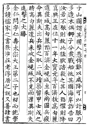 [或云<苔宗>.]姓金氏, <奈勿王>四世孫. <智度路王>時, 為沿辺官, 襲<居道>権謀, 以馬戯, 誤<加耶[或云<加羅>.]国>取之. 至十三年壬辰, 為<阿瑟羅州{何瑟羅州}> 軍主, 謀并<于山国>. 謂其国人愚悍, 難以威降, 可以計服, 乃多造木偶師子{獅子} , 分載戦〓, 抵其国海岸, 詐告曰: 汝若不服, 則{即} 放此猛獣, 踏殺之. 其人恐懼則{乃} 降.