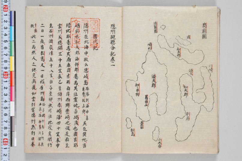 隠岐島は北海(日本海)の中にある。[思うに、大和言葉で海の中を「おき」というので、このように名付けたのだろうか]その南東にある地を島前と言う。知夫郡と海部郡がこれに属する。その東にある地を島後と言う。周吉郡と穏地郡がこれに属する。その府は周吉郡南岸の西郷豊崎である。隠岐島より南、島根県の美保関までは35里。(隠岐島から見て)東南にある鳥取県の赤碕浦までは40里。南西にある島根県の温泉津までは58里。北から東に至る間には、目安となる地がない。北西の間には、二日一夜行くと、松嶋(現・竹島)がある。さらに、一日の行程のところに竹島(現・鬱陵島)がある。[俗に磯竹島という。竹・魚・アザラシが多い。思うに神書に記述のある五十猛の神だろうか。]この松嶋と竹嶋の2島は無人島である。そこ(現・鬱陵島)から朝鮮が見えるのは、ちょうど出雲から隠岐島を遠望するのと同じである。ならば即ち、日本
