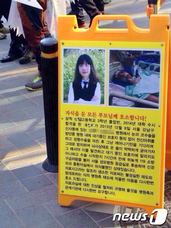 11일 오후 한 트위터리안(@writerRJ)은 "가로수길 가다 발견. 신사역 ***성형외과 의료사고 때문에 피켓 시위 중. 고3 꽃다운 나이에 뇌사라니…"라는 말과 함께 피켓 사진을 게재했다.