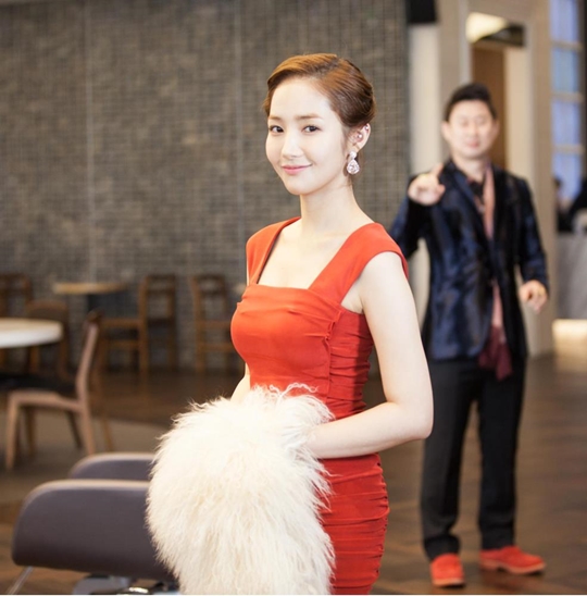 이어 박민영은 강렬한 빨간색의 드레스로 볼륨감 넘치는 몸매를 자랑해 시선을 사로잡는다. 여기에 깔끔하게 올린 업스타일의 헤어는 우아한 매력을 배가시키고 있다.