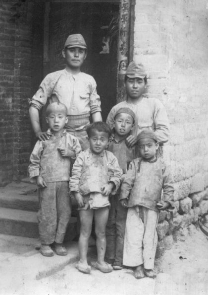 日中戦争当時日本軍の侵略に死亡した 中国人孤児少年 4名菓  親しいポーズで写真を撮る 日本軍の政治宣伝写真