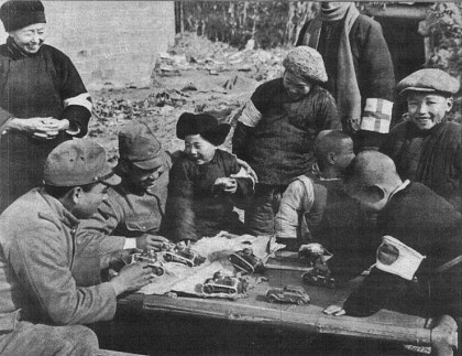 난징 침략 이후 난징성 부근에서 중국 어린이들과 장난감 탱크를 가지고 노는 일본군  - 1937년 10월 20일