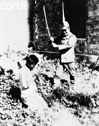 도둑질을 저지른 혐의로 의심되는 중국 빨치산 소년을 붙잡아 참수하는 중국을 침략한 일본군 - 1938년