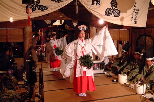 神室山信仰の神事として奉納した地謡、地舞が定形化してできあがったもので烏舞、会我、大江山、三番叟など前期能楽としては優秀なものである。